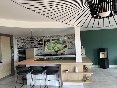 Remettre au goût du jour l’espace vie par un papier peint haut en couleur qui impose la personnalité de la piece, une selection de mobilier, de luminaires et matières textiles insufflent un esprit gai et chaleureux.